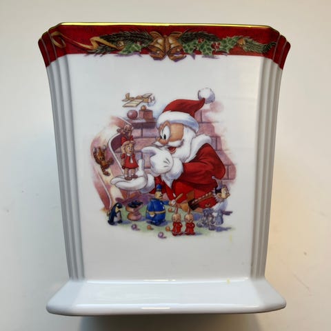 Selger en dekorativ blomsterpotte med sjarmerende julenisser og elegante gulldetaljer fra Firkløveren, designet av Lars Carlsson. Perfekt som julepynt eller gave!
