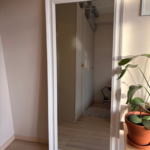 Speil med hvit ramme, 68x152cm. Kan henges på vegg eller stå på gulv. Kjøpt på Jysk tidligere i år, selges grunnet flytting.
