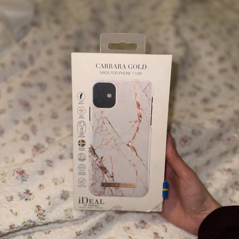 IDEAL OF SWEDEN Telefondeksel for iPhone 11/XR med marmorert beige og hvit design. Dekselet er laget for å beskytte telefonen og har et elegant utseende med merkeplate i gullfarge.