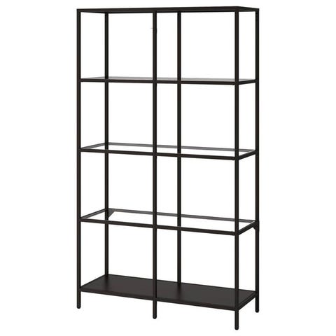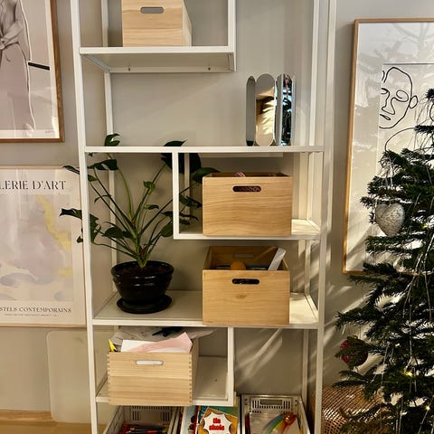 Pent brukt hvit hylle, med en liten synlig skade på ene panelet.