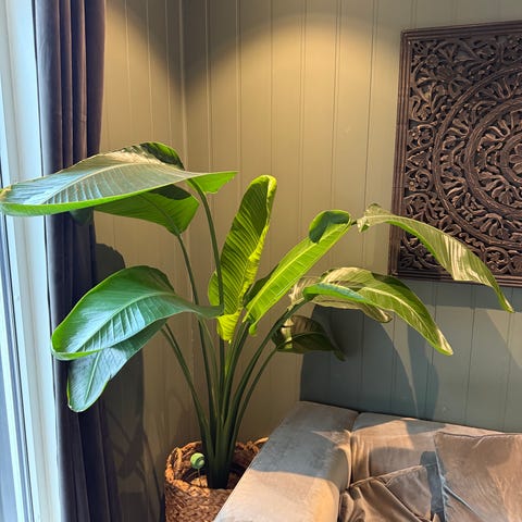 Strelitzia er en stueplante med store, grønne blader. Planten trives i innendørs miljøer og kan brukes som dekorativt element i hjem eller kontor.