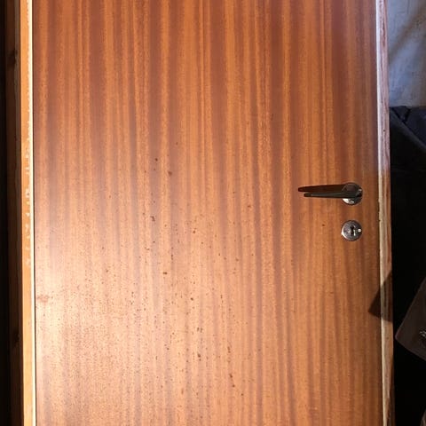 Hvit innerdør i malt tre med karm. Døren har en klassisk design med fyllinger og passer til bruk innendørs. Kan brukes i boliger eller kontorlokaler for romavgrensning.