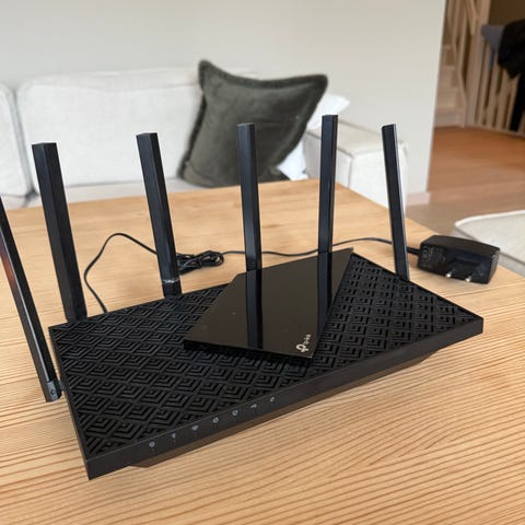TP-Link Archer MR200 Router med 4G+ Dual Band støtte. Enheten tilbyr trådløs nettverkstilkobling med høy hastighet og stabilitet, egnet for hjemme- eller kontorbruk.