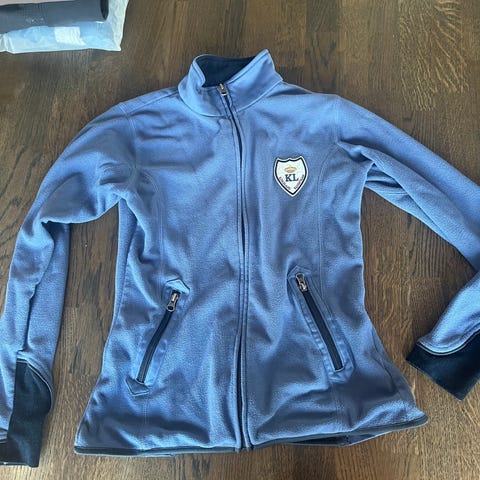 La Valencio jakke for dame i mørk blå. Jakken har quiltet mønster på fronten og glidelås i front. Ermer har dekorativ tekst og detaljer.