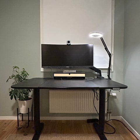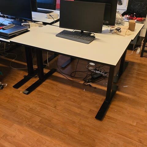 Hev senk pult fra ikea selges billig grunnet merke på bordplate. Dette merket har vi sjeldent sett/tenkt over da vi har en PC matte som vi har brukt til å skjule det og det ikke har hatt noe fysisk betydning. Nå skal vi reorganisere rommet og denne pulten blir for stor.
