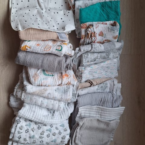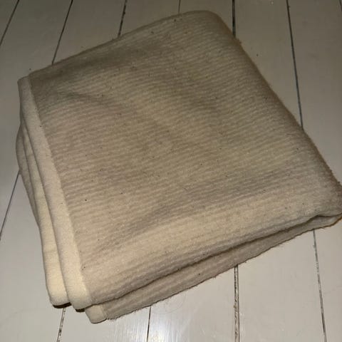 En full bærepose med tepper/kluter selges samlet. Røyk og dyrefritt hjem.