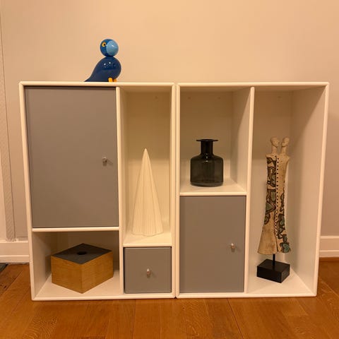 Selger en stilren og praktisk vegghengt TV‑benk fra Montana. Møbelet er i hvit utførelse med en dekorativ rød kontrasthylle. Front med frostet glassdør og to dype hyller med god oppbevaringsplass på høyre side.