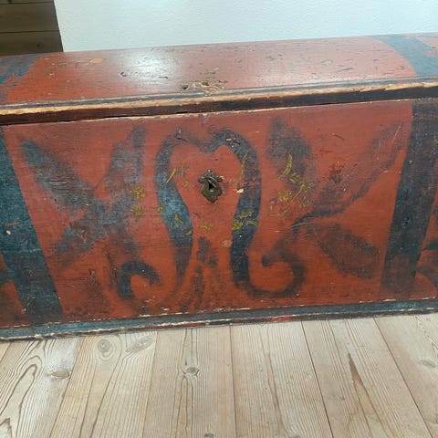 Antikk kiste laget i tre med metallbeslag. Kisten har en buet lokk og et innvendig rom med et mindre uttrekkbart rom. Fargen er blå med svarte metallbeslag. Kisten egner seg til oppbevaring av ulike gjenstander.