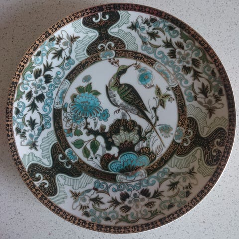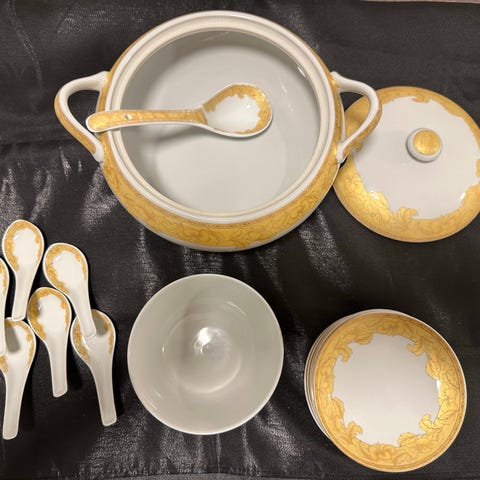 10 stk. Suppeskål med fat laget i porselen selges. Suppeskålen har to håndtak og et dekorativt mønster på fatet.