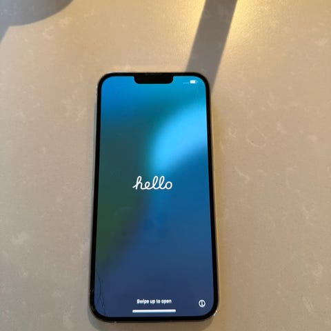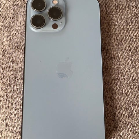 Apple iPhone 13 Pro Max mobiltelefon med 128 GB lagringskapasitet. Enheten har en skjerm med tydelig visning og et bakdeksel som er skadet.