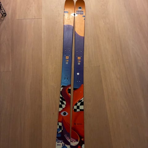 Skaden er lokal og ikke reparert. Skiene har fortsatt bruk igjen og selges derfor rimelig.