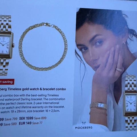 Mockberg damearmbånd laget av gullbelagt materiale og stål. Armbåndet har en enkel og stilren design, egnet for daglig bruk eller spesielle anledninger. Et elegant armbånd med et mykt og flytende design. Laget av rustfritt stål med 18K gullfarget PVD-belegg – slitesterkt og vannavstøtende, og bevarer både farge og glans over tid. Forlengelseskjeden kan enkelt fjernes for en tilpasset passform.