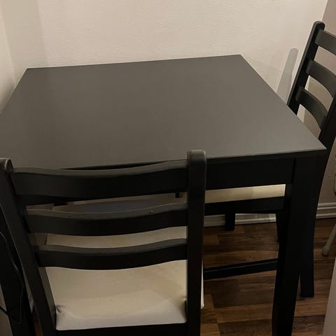 Pent brukt IKEA spisegruppe med bord og 4 stoler. Små bruksmerker. Bordbein er demontert for enklere transport, kan enkelt remonteres. Må hentes fra Storo fra 2. etasje uten heis.