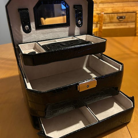 Smykkeskrin for barn. Med speil, blinkende lys rundt speilet, egne rom til små smykker som kan tas ut. Lås i metall. I serien Top Model.
