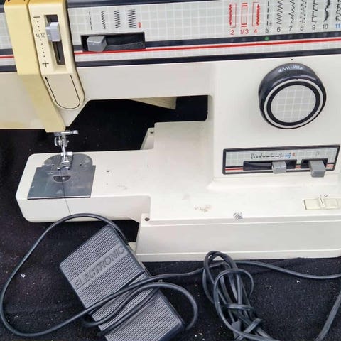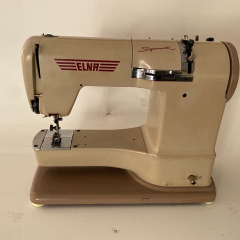 Singer symaskin med hvit og gullfarget 60 talls design. Svært solid maskin i helmetall. (Ingen plast tannhjul eller drivremmer. )