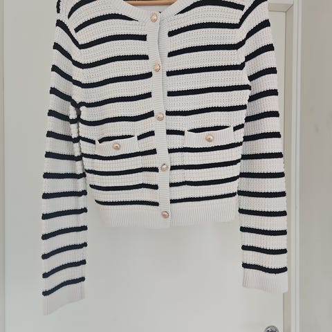 Offwhite cardigan med svarte striper fra H&M i størrelse S (løs fasong). Omkrets bryst er 102 cm, livvidde 98 cm og lengde 52 cm. Laget av en blanding av bomull og akryl. Aldri brukt, tag henger fortsatt på. Ordinær pris var 299 kroner.
