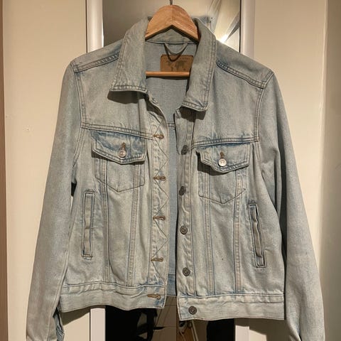 Kul rocka dongerijakke med sølvfarget maljer, pent brukt fremstår som den gjorde ved kjøp. Tykk kvalitets denim uten stretch.