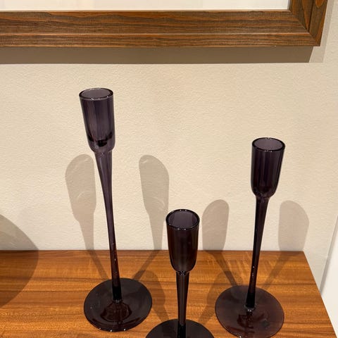 Hadeland Glassverk blå glass lysestaker med ulik høyde og design. Lysestakene har en klar og blå fargekombinasjon med solide glassbunner. Passer til dekorasjon og bruk som lysestaker i hjemmet.