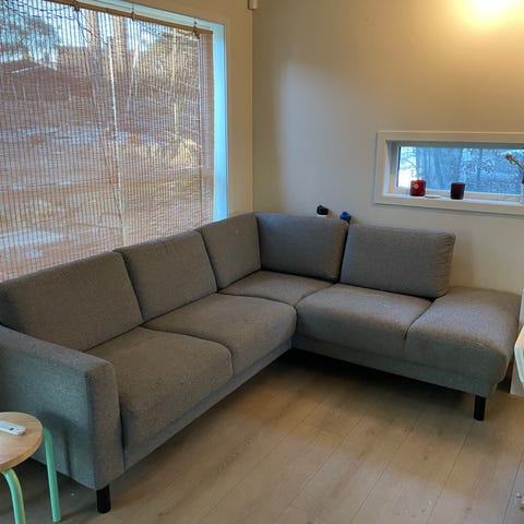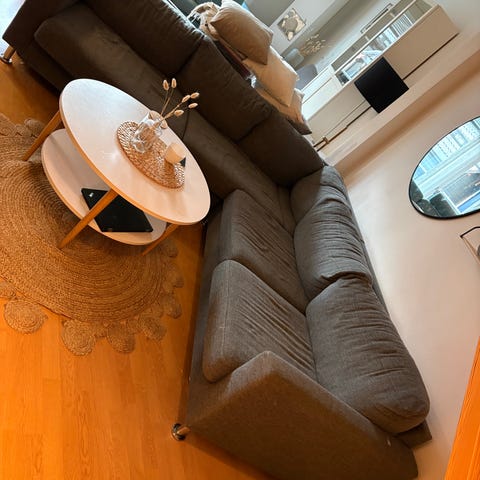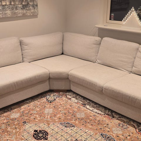 Kjøpte denne sofaen brukt for noen år siden. Har vært brukt av barn på tv stue siden. Det er noen bruksmerker på den i form at tusj. Ser bilde. Den trenger nok en rens. Vil si at det er mye sofa igjen. Må hentes så snart som mulig