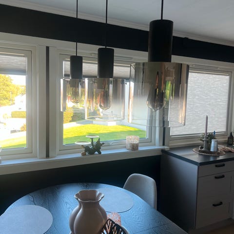 Tornado-pendellampen med tre flammer er perfekt for å belyse et spisebord eller en bar i et moderne rom. Skyggene deres, hver laget av tre overlappende metallstrimler, gjør at lyset kan gå direkte oppover og nedover, men en del av det faller også gjennom mellomrommene mellom de enkelte metallstrimlene og skaper unike lyseffekter i rommet. På grunn av den matte svarte fargen blir hengelampen en slående lysgjenstand over hvert bord.