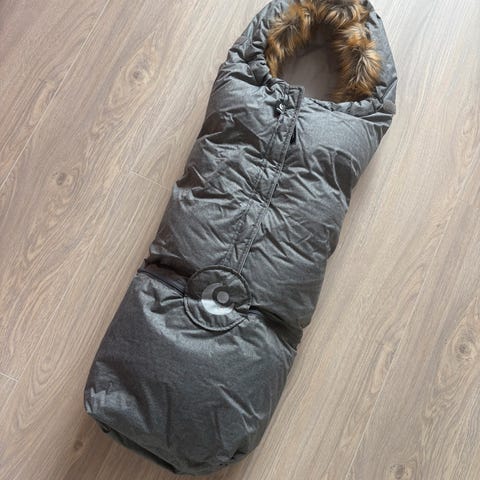 Vinter-vognposen Nord fra Easygrow i grå. Tykk og god, kan snøres i hetta. Dunet kan tas ut, slik at man kun trenger å vaske trekket. Følger med forlenger og fuskepels til hetten. Vasket før salg. Fotdelen er tromlet, siden man ikke kan ta ut dunet der, og det er derfor litt tennisball-lo i borrelåsen. Ingen flekker.