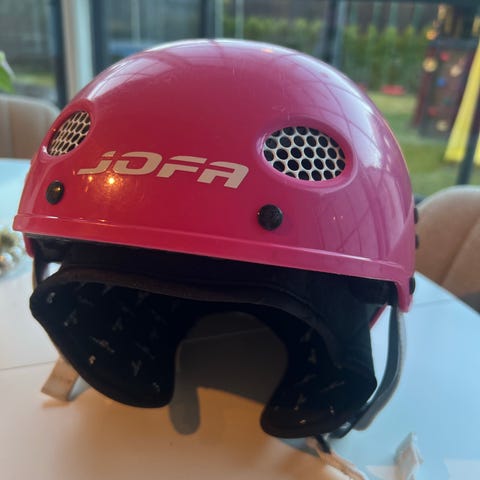 Jofa 415 hjelm i svart farge. Hjelmen har ventilasjonshull og justerbar stropp under haken for sikker passform. Egnet for bruk ved aktiviteter som krever hodestøtte og beskyttelse.