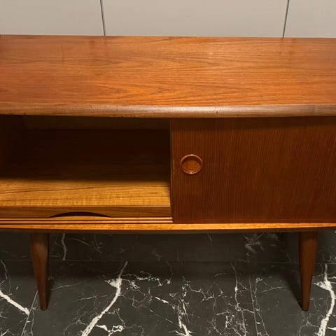 Veldig fint holdt teak kommode med messing håndtak og lås på øverste skuff.