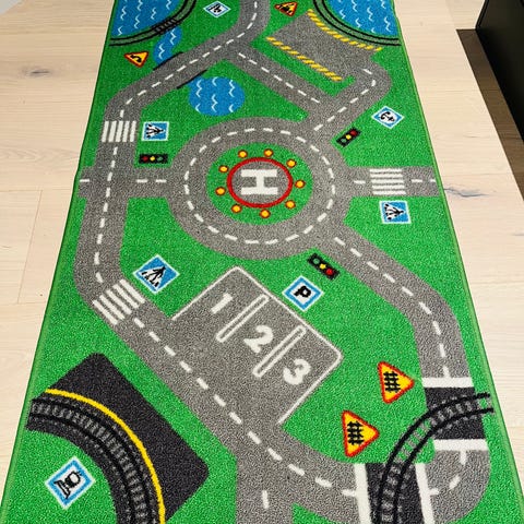 Pent brukt lekematte til barn. Bilvei, dyr og mange andre artige detaljer de liker. Matten en god og tykk. Måler ca 91 cm × 91 cm.