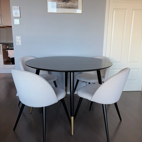 4 stoler. Brukt som ekstrastoler, derfor pent brukt. Nette og passer fint å dytte til bordet.