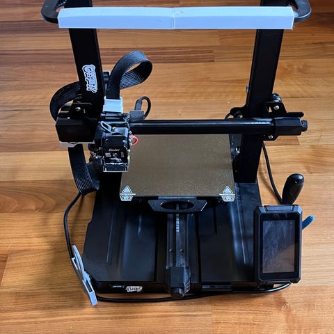 Creality Ender 3 v3 Plus 3D-printer med stor byggevolum og robust ramme. Egnet for presisjonsutskrift av ulike materialer. Utstyrt med filamentholder på siden for enkel tilgang.