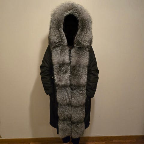 Jeg selger en vinterjakke med naturlig pels. Blå frostpels, svart rev + fjellrev. Pelsen er helt avtagbar, både på hetten og på jakken. Kan brukes på forskjellige måter. Stoffet er thinsulate, vanntett, vann renner ned uten å bli absorbert inn i stoffet. Jeg er 168 år høy, vekt 75-80 kg. Størrelsen kan være fra L til XXL, da den reguleres med en snøring i midjen. Jakken ble sydd på bestilling i juni 2025, et enkelt eksemplar. Et lite kupp er mulig.