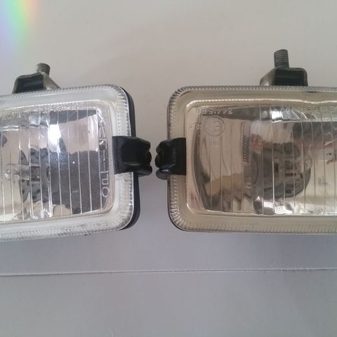 Hella Rallye 3000 ekstralys sett med to lamper. Lampene har en rund form og inkluderer beskyttelsesdeksler med Hella-logo og Rallye 3000 merking. Passer til montering på bil for ekstra belysning.