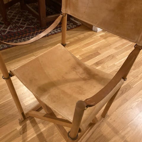 Selger 2 stk. safari stoler i kvistfri furu og kanvas. Kanvasen på begge stolene er revnet i sete. Planen var å trekke om, men det ser ut til å bli vanskelig å få til.