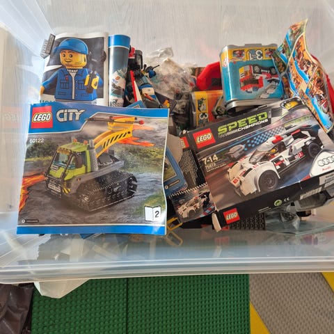 Tre store esker med legoklosser med monteringsanvisning. I veldig god stand. Disse inkluderer et sykehus, en togstasjon, politistasjoner, helikoptre, fly, et tog og mye mye mer.