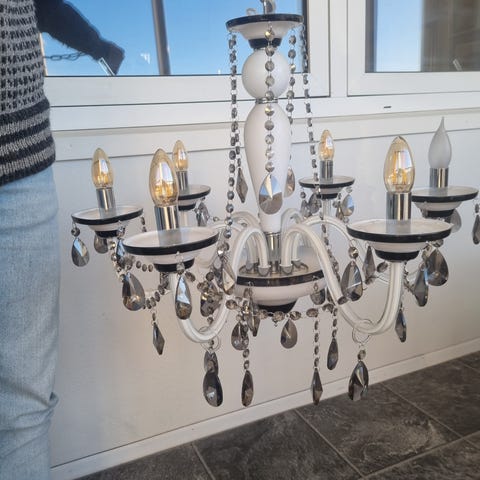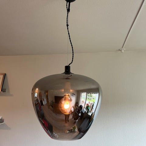 Selger 2 stk takpendler i glass og krom. Høyde 40cm diameter 30cm