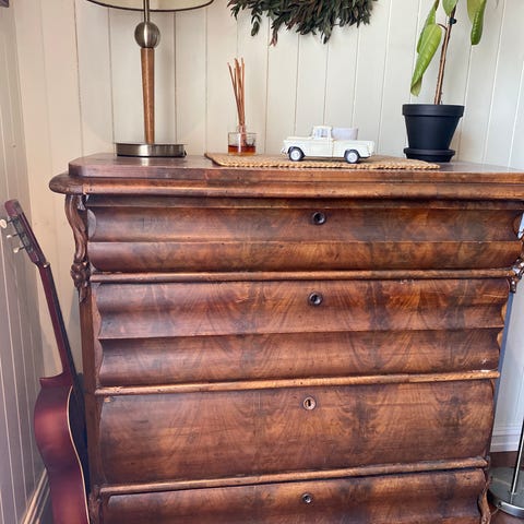 God gammel kommode, trenger litt maling og puss på toppen, ellers fin. Skuffer er hele og fine.
