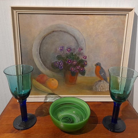 Originalt, usignert maleri – fargerikt stilleben i ramme (59 × 69 cm)