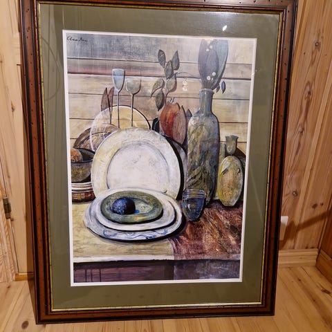 Leveres med dekorativ gullfarget ramme og er klart til å henges opp. Pent brukt og i god stand.