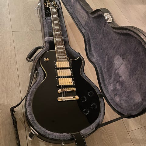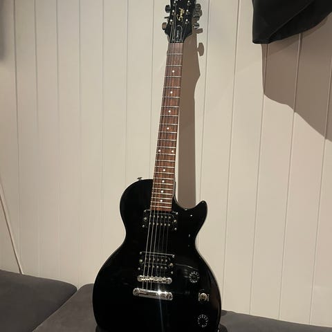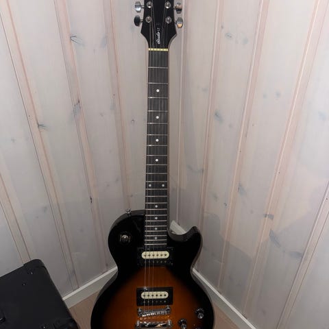 Epiphone Les Paul elektrisk gitar med sunburst finish. Gitaren har en kropp i klassisk Les Paul-stil og er utstyrt med standard tuning maskiner og en hals med dot inlays. Passer for gitarister som ønsker en solid elektrisk gitar med tradisjonelt utseende.