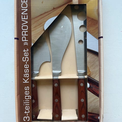 Settet inneholder ulike verktøy egnet for servering og skjæring av ost.