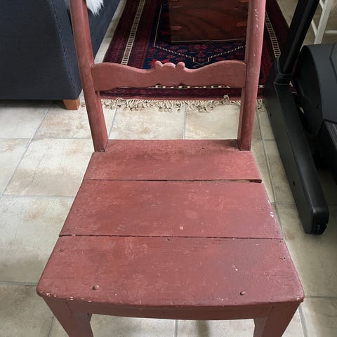 Kan bli en veldig fin stol om man fletter den på nytt. Har blitt malt svart. Tror det er en Jærstol.