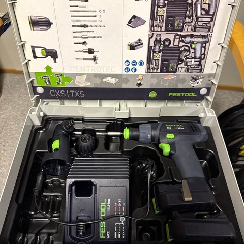 Amatørbrukt festool drill med lader og 2 stk 18v batterier. Kommer i systainer. Innhold vises på bildene