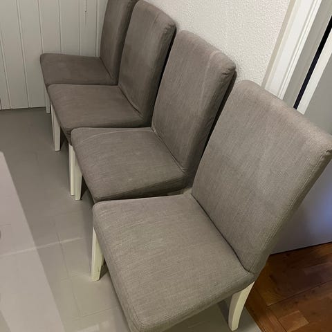 Lite brukte spisestuestoler fra IKEA av typen Henriksdal. Noen mindre flekker, kan sikkert vaskes /renses vekk. Mulig å kjøpe ny trekk til stolene. Selges kr 300 pr stol.