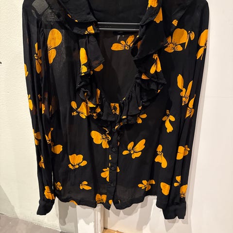 Lekker Ganni-bluse i størrelse M. Mørk blå med hvite prikker, delikate volanger og fine mansjettdetaljer. Lite brukt og fremstår som hel og pen uten skader eller slitasje.