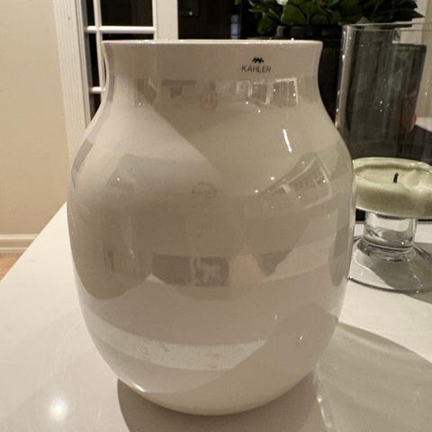 Meget pent brukt Kähler vase. Stor hvit vase med sølv striper str 30 cm. Helt og fin. Selges pga plassmangel. Kjøpt på tilbords.
