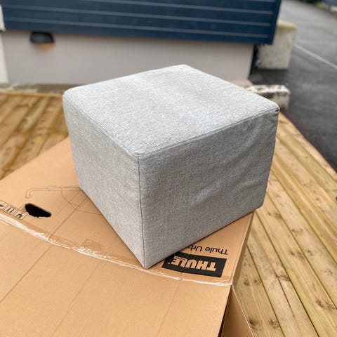 Pen stor grå puff med oppbevaring som kan legges sammen. Str. 76x76 cm bredde, 44 cm høy. Sorte ben som skrus av hvis en skal legge puffen sammen.