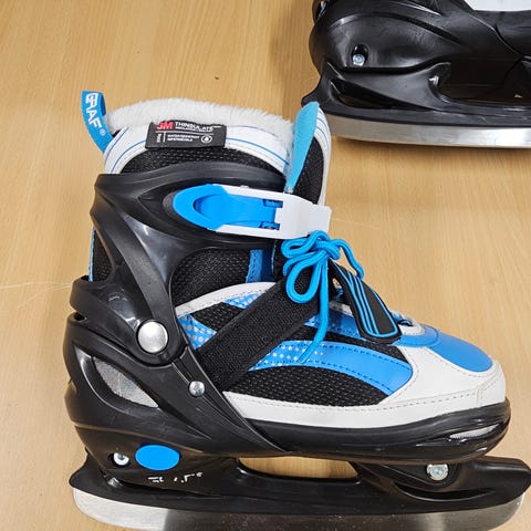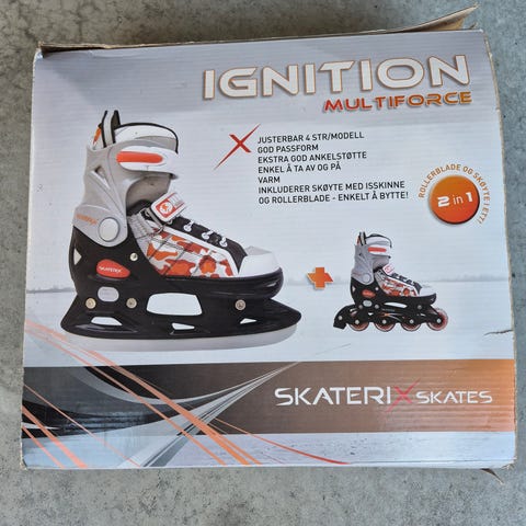 Ignition Multiforce justerbar ishockey/rulleskøyte i justerbar størrelse 33-36. Skøyten har både isskinne for is og hjul for rulleskøyting. Veldig enkel justering av størrelse, kun trykknapp. Isskinne har aldri vært brukt, rullene har vært brukt kun noen få ganger.
