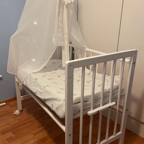 Pen, hvit bedside crib. Perfekt de første seks månedene med baby. Settes inntil foreldresengen for å ha lett tilgang til baby ila natten. Kan heves/senkes til flere høyder, og kan ha tre eller fire «vegger». Liten fuktskade i bunnen, se bilde, noen merker i hjørnene.