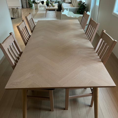 Solid spisebord med 6 stoler selges. Møblene er brukt og har bruksmerker.