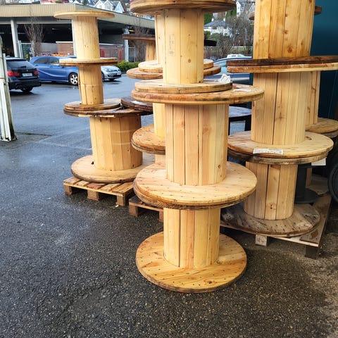 Hagemøbler laget av tre, inkludert benk/sofa og bord laget av paller og kabeltrommel. Møblene har en rustikk stil og er egnet for utendørs bruk på terrasse eller hage. Blir veldig fint med puter og pledd osv🥰